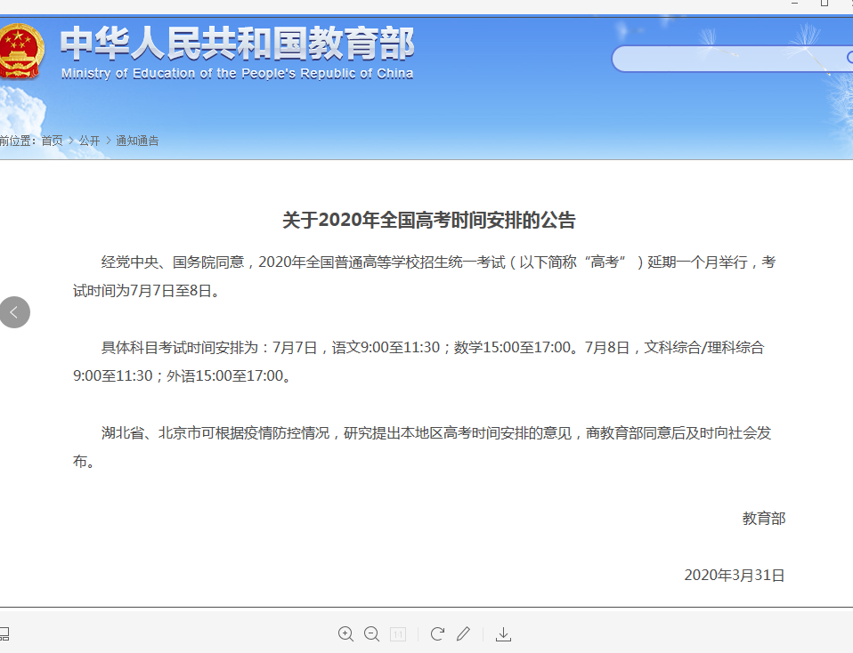 经党中央、国务院同意,2020年全国普通高等学校招生统一考试(以下简称“高考”)延期一个月举行,考试时间为7月7日至8日。