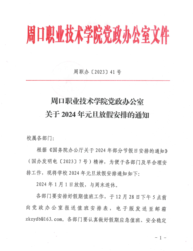 周口职业技术学院党政办公室关于2024年元旦放假安排的通知