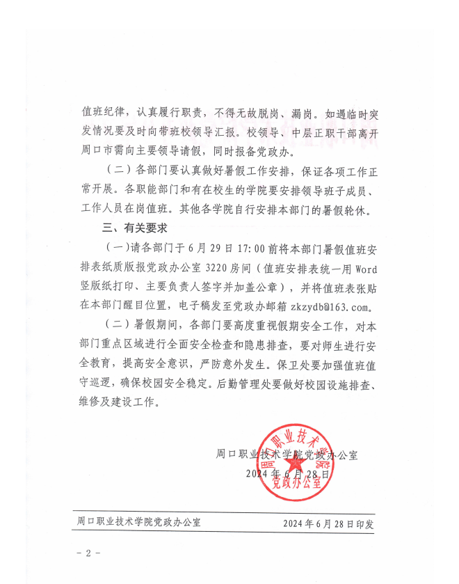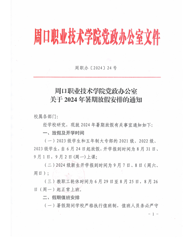 周口职业技术学院党政办公室关于2024年暑期放假安排的通知