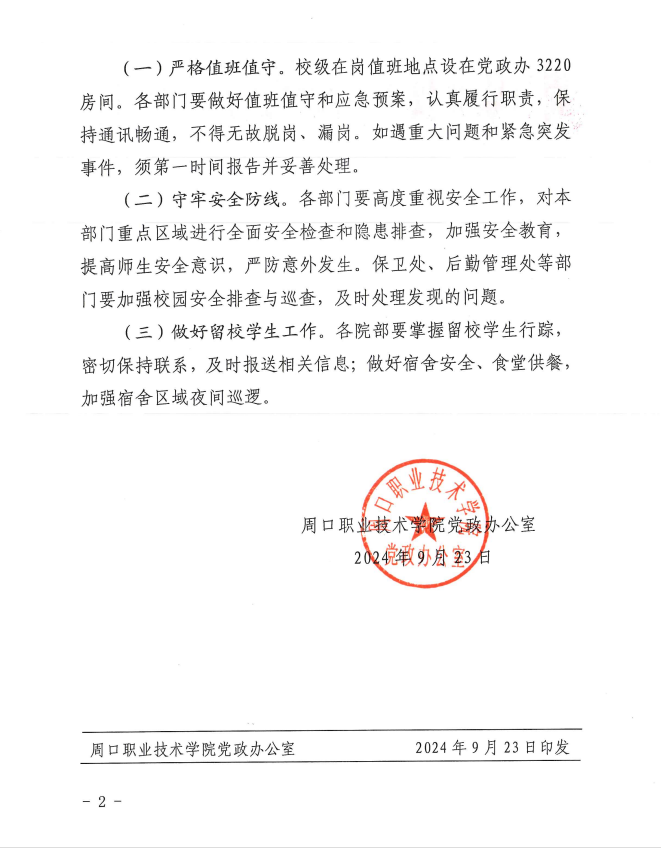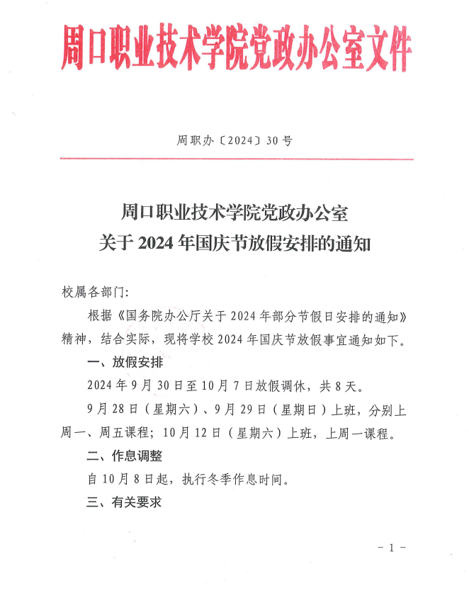 周口职业技术学院党政办公室关于2024年国庆节放假安排的通知