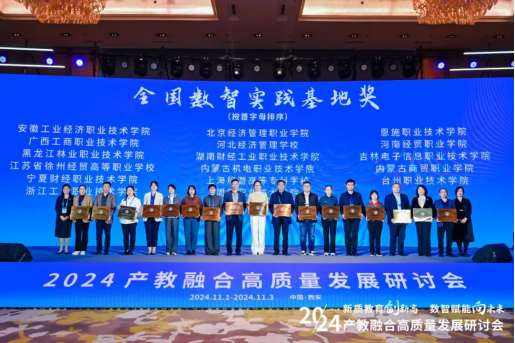 九九热九九作为全国数智化实践基地参与方,在院长袁向华带领下紧跟职业教育发展前沿,致力于内涵发展,创建数智财经实践基地,积极探索职业教育改革与财经专业建设的实践路径,在产教融合,共建实训基地方面取得突出成就,被评选为全国优秀数智产业学院奖,院长袁向华代表学校上台领奖。