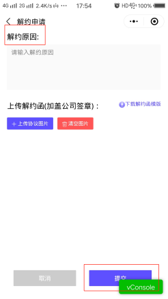进入本次签约【详情】,点击【解约】,填写原因提交审核。