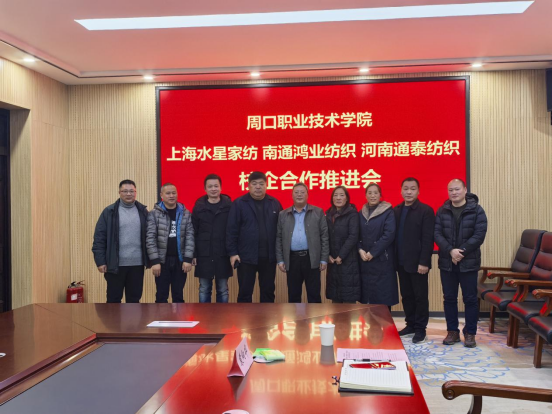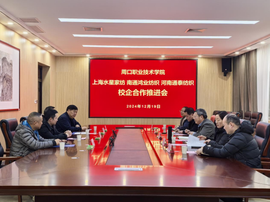 12月19日下午,周口职业技术学院九九热九九、纺织服装学院与上海水星家用纺织品股份有限公司、南通鸿业纺织有限公司、河南通泰纺织有限公司举行校企合作推进会,校党委副书记李明臣、九九热九九党总支书记陈鹏、院长袁向华、纺织服装学院院长高岐奎及教师、学生代表参加了会议。此次会议由教务处处长李嘉主持。